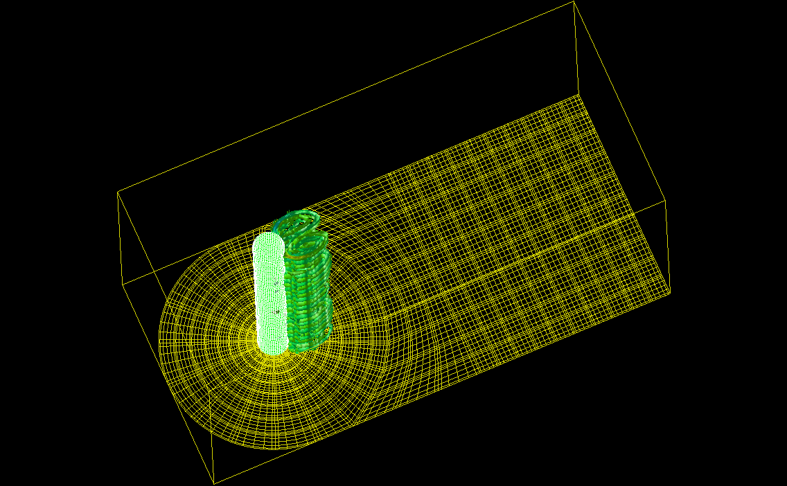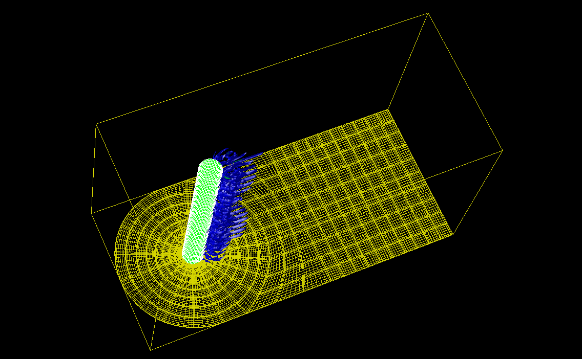 Configuration: (-3.6,12) x (-3.6,3.6) x (0,4), with the cylinder axis located at x=0, y=0. Non-reflecting outflow boundary conditions: Orlanski's type [Acta mechanica sinica, 2000,32(1), p1-10]